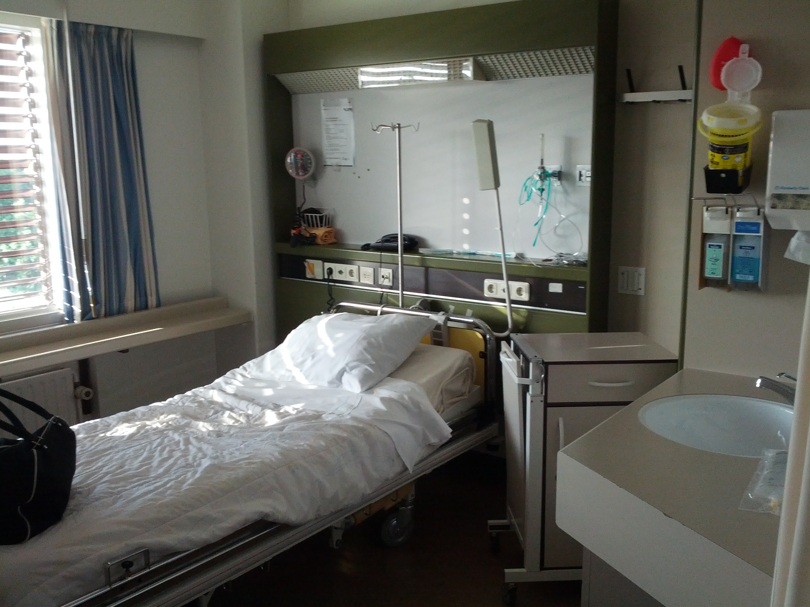 Ik kreeg wederom een Royal Treatment in het Elisabeth ziekenhuis. Een eenpersoonskamer (ensuite) met uitzicht op het helikopterplatform a la Grey’s anatomy! Helaas alleen mijn eigen bloed gezien en niet dat van Grey’s Anatomy taferelen..